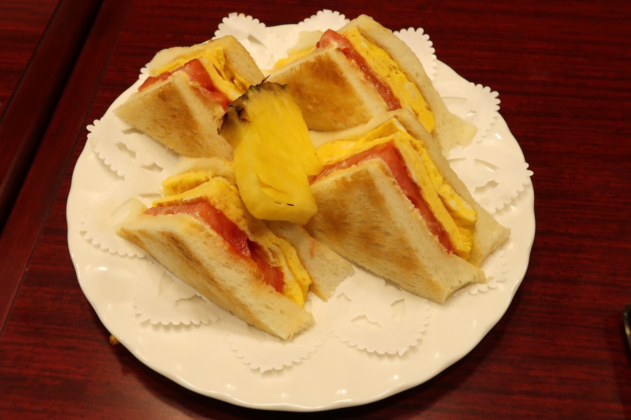 朝7時から営業している老舗喫茶店です。大阪駅から谷町線東梅田駅方面へ地下道を歩いてゆくと、7番出口そばにありました。モーニングメニューが豊富にそろっていて、ドリンク代のみでOKのメニューも3つありました。ドリンク代+420円の卵トーストサンドモーニング、人気のホットケーキセットをいただきました。セットの紅茶は、紅茶専門店アムシュティーの茶葉でした。