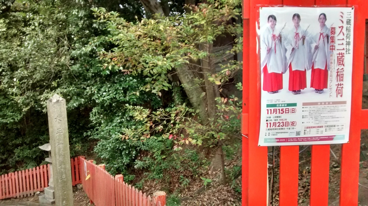 三蔵稲荷神社は、福山城公園内にある日本建築や様式の美しい場所で、絶対見逃せない観光アトラクションだと思います。添付写真のように、なんと「ミス三蔵稲荷」の募集ビラがあって、とても面白いと思いました。モダンになったものですね。