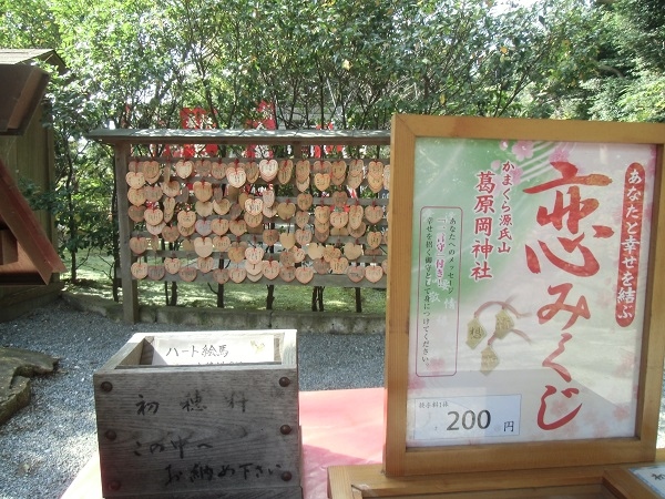 境内では恋みくじが売っており、ハート型の絵馬が鈴なりになっています。