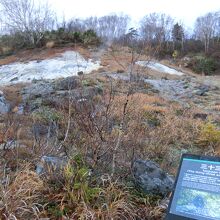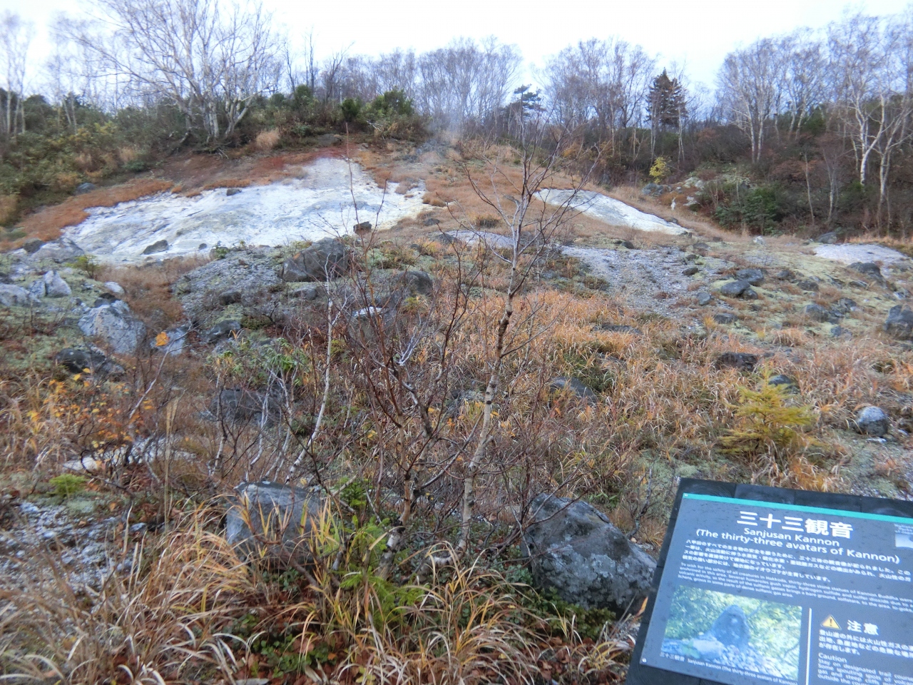酸ヶ湯温泉から地獄谷の間にあります。八甲田のすべての安全を願うために自然石で33体の観音様を造ったそうです。今は、風化や劣化により観音様の姿や形は判別できなくなっているそうです。近くからは、白いガスが噴き出していて、立ち入り禁止になっていました。