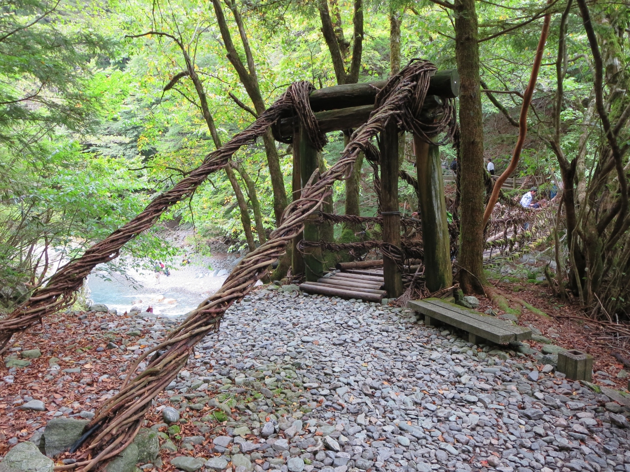剣山登山を終えて、国道439を7㎞あまりで到着できます。この国道は昔は大変な道でしたが、今ではずいぶん走りやすくなっています。道路沿いに設けられた駐車場に空きスペースを見つけ駐車し、料金所から階段を下りて行きます。祖谷のかずら橋よりも小規模なものですが、二重にあるのがこの橋の特徴です。また野猿(やえん)もあり体験できるので楽しい時間が過ごせます。