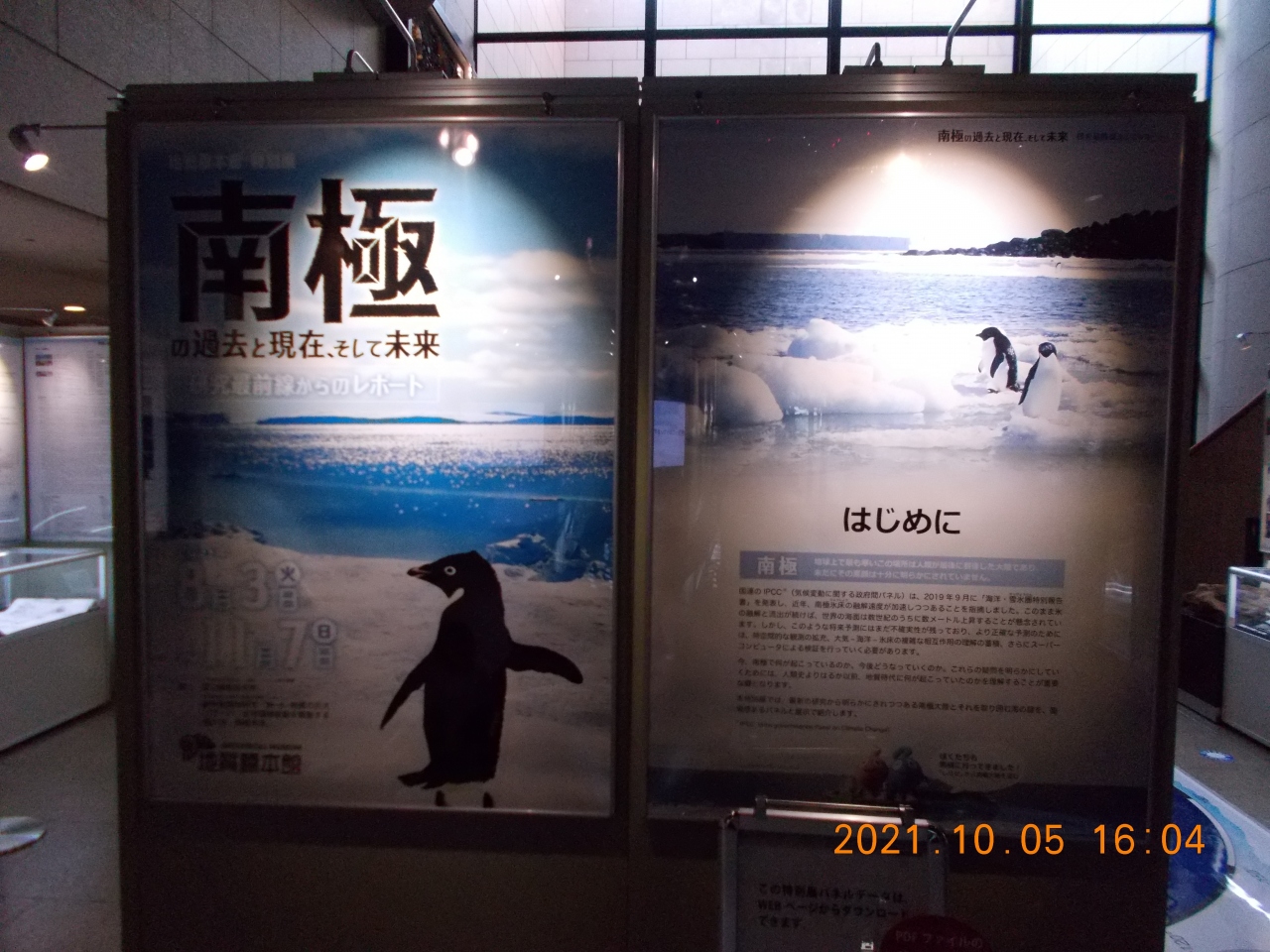 入館したところのロビーで、南極に関する企画展が開催されていた。地質標本館ということで、氷河の下の泥を調べたり、温暖化の過去と未来について調べたりする様子や結果が説明されていた。海底に設置してマリンスノーを補修する装置も展示されていたり、日本が実施している観測についても紹介されていたりした。