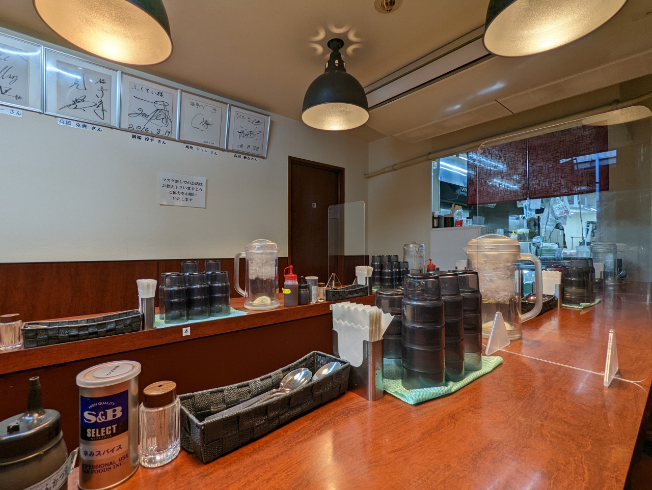 入口入って店内の脇にある券売機で予め食券を購入する必要があります。店そのものが小さく、カウンター席後ろの通路もやや狭く、また座席の高さも高いため、車椅子等の障碍を持つ方は利用しづらいと思うかもしれません。