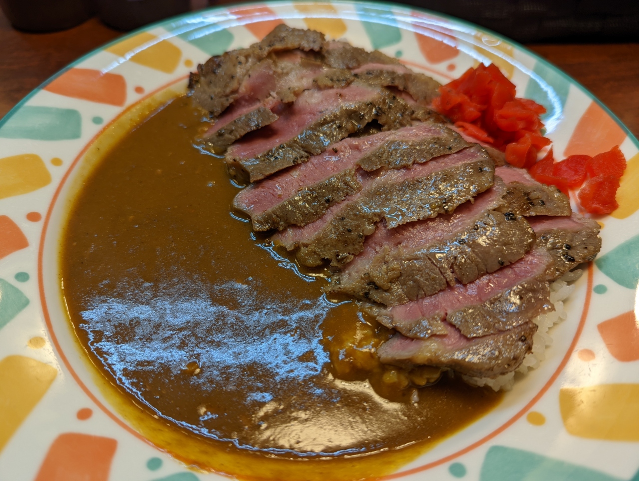 カウンター席20席程度という小さなカレー店ですが、その特徴は何といってもその安さにあります。トッピングの無いライスとルーのみのカレーだけでも500円未満で食べられます。この店のお勧めである、薄めにスライスされたステーキ(ミディアムレア)がトッピングされた『ステーキカレー』でも670円と安いです。一方で量は多くはありませんので、たくさん食べたい人からすると少し物足りないと感じるかもしれません。一方で、軽めに食事をとる人からすれば、非常にリーズナブルな価格で料理を堪能できる、という側面もあります。スライスされたステーキの他、唐揚げやポークソテー等の肉類だけでなく、ナスや温泉玉子などのトッピングもあります。