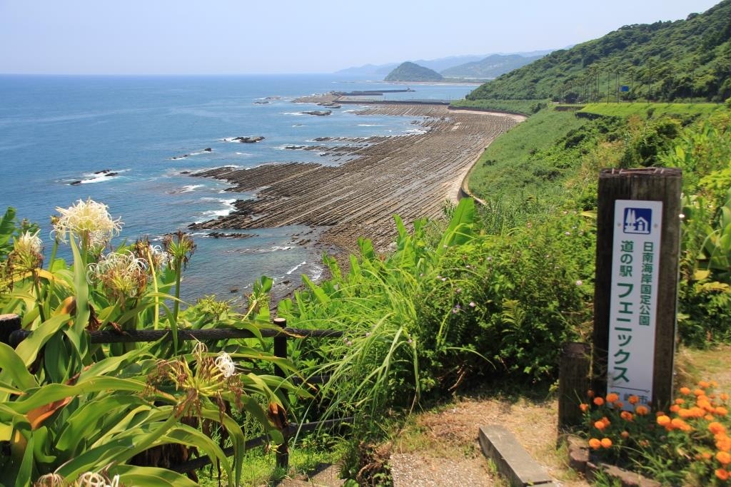 道の駅自体は道路の山側にあるのですが、横断歩道で道路を渡ったビュースポットから日南海岸の鬼の洗濯板を眺めることができます。