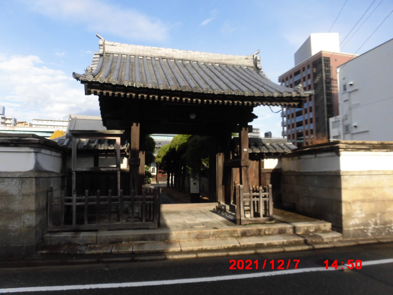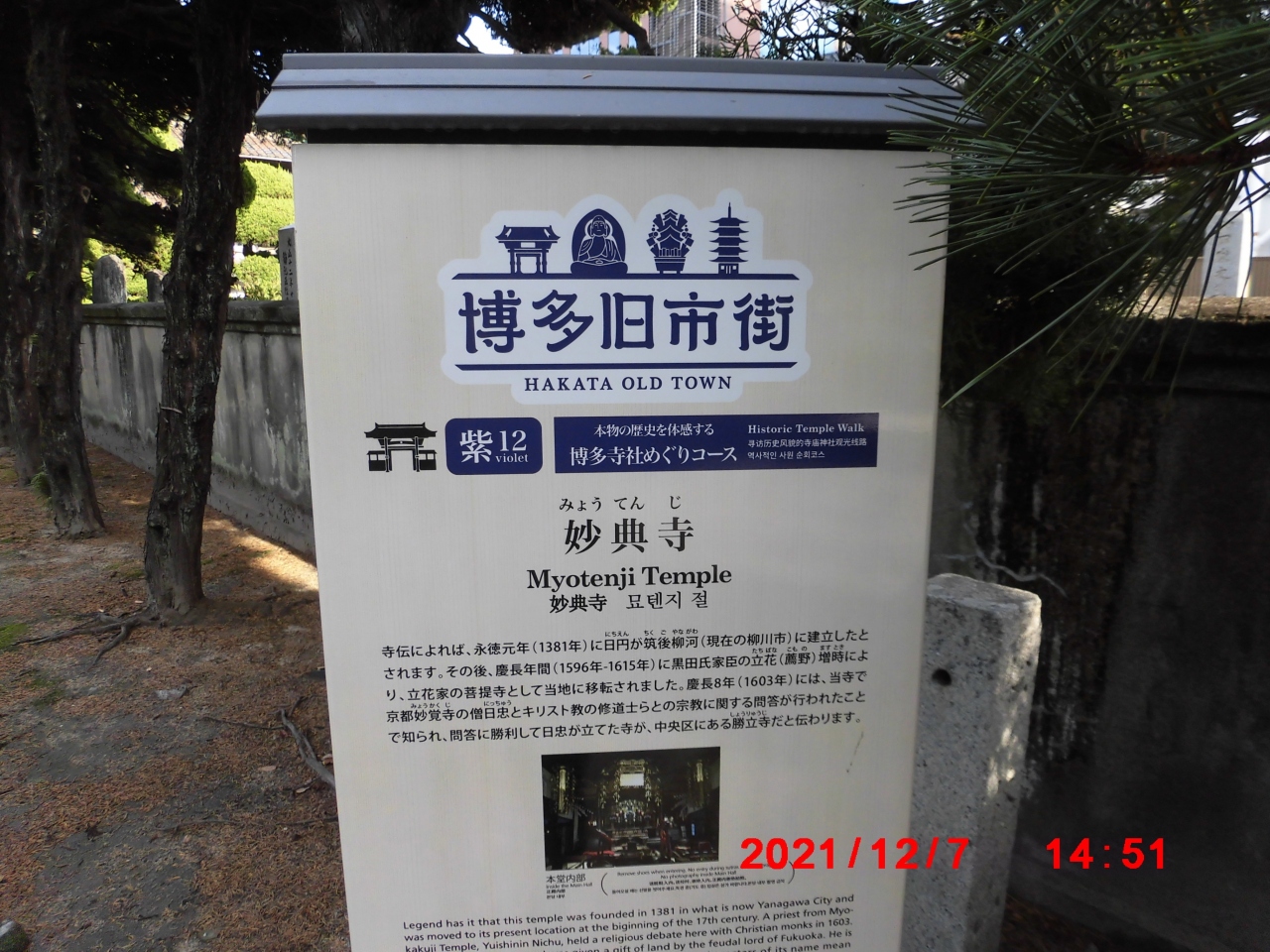 福岡市博多区観光で立ち寄りました。瑞祥松林山「妙典寺」は、御笠川に架かる東大橋から西に1分、明治通り沿いにある日蓮宗の寺院です。創建は14世紀後半、博多の日蓮宗寺院では最も古く、京都妙覚寺の僧「日忠」とキリスト教の修道士らによる宗教に関する問答が行われたお寺として有名とのことです。