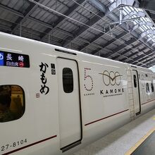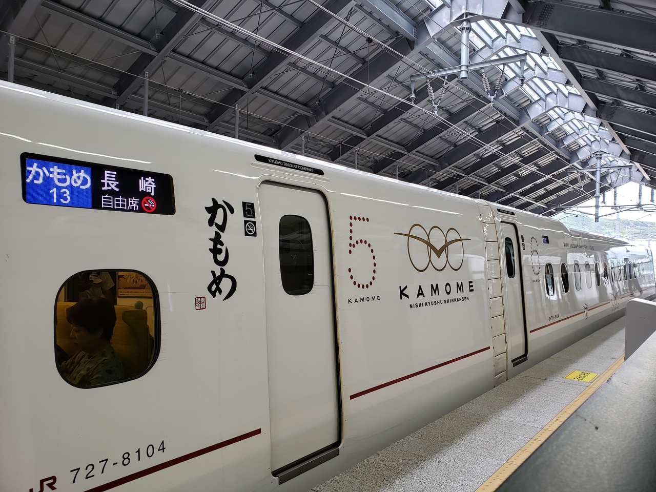 開業したばかりの西九州新幹線。リレーかもめで武雄温泉に到着し、すぐ向かいのホームから出発する新幹線かもめに乗り換え。乗り換えはとてもスムーズでした。リレーかもめの車両は、JR九州らしくデザイン性に富んでいて素敵です。