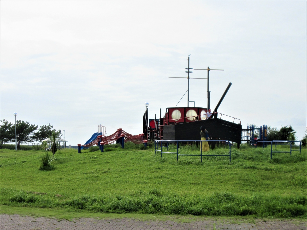 いいおかみなと公園は、広大な敷地に、丘の上の四阿や海賊船の形をした遊具もあります。