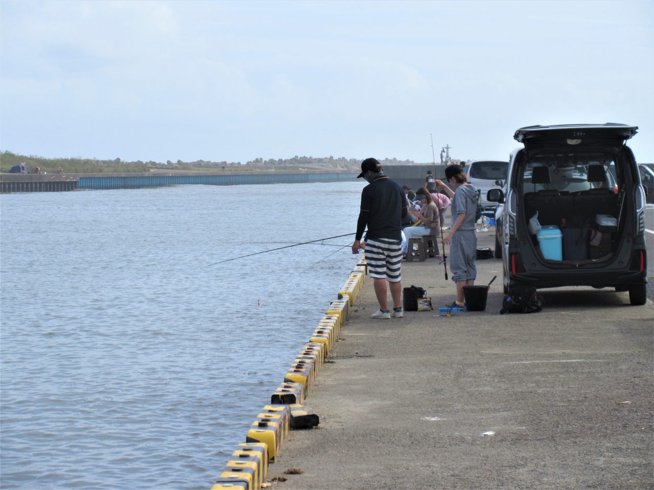 飯岡漁港に面した防波堤では、たくさんの釣り人が釣りを楽しんでいます。ここならば漁港ではないので、自動車を防波堤までつけることが出来るので便利で楽です。