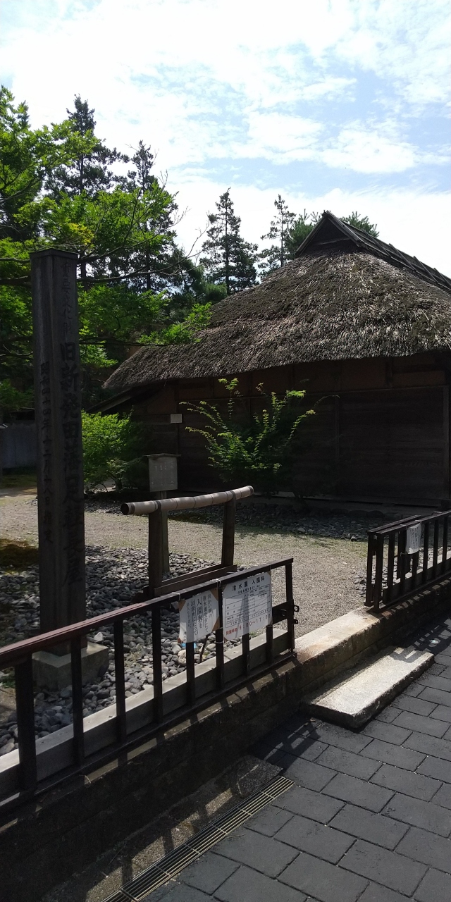 清水園近くにある長屋。国の重要文化財に指定されています。長屋自体は城下町に残っている例は各地にありますが、この長屋は茅葺であることが特徴で、近づいてゆっくり見学することもできます。この周辺は水が豊かな場所で、水のせせらぎを聞きながらめぐることができる落ち着いた場所になっています。