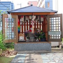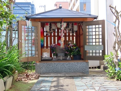 和歌山城の北側、市堀川にかかる中橋のたもとにあるお地蔵さまです。1945年(昭和20年)7月9日の和歌山空襲の際、川に飛び込んで多くの方が亡くなりました。犠牲者の霊を弔うために1970年(昭和45年)にこのお地蔵さまが建立されています。数百メートルしか離れていない汀公園にも犠牲者の慰霊碑があり、空襲被害の甚大さが伝わります。