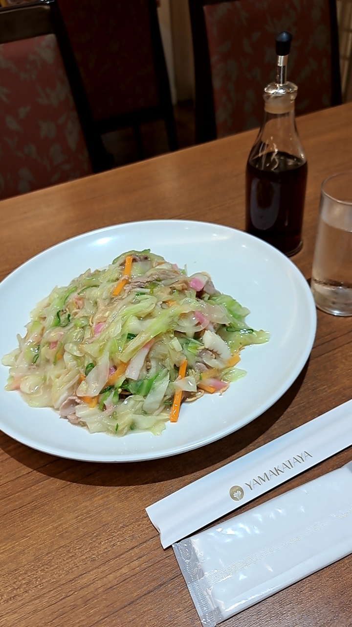 こちらの名物は「焼きそば」です。フライ麺に餡がかかったタイプで、三杯酢はお好みでかけると美味しいです。餡の海鮮も豊富で、ボリュームもあります。