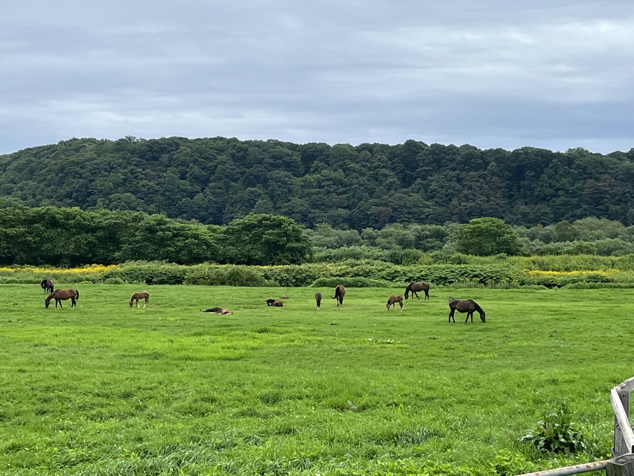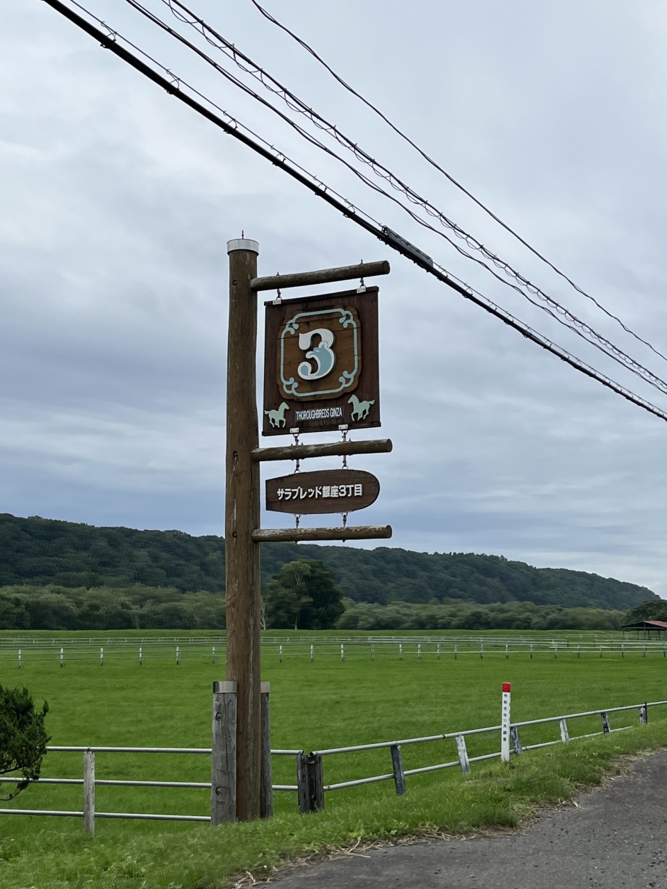 道道209号線の一部区間がサラブレッド銀座との愛称で呼ばれています。サラブレッド銀座駐車公園から優駿記念館があるあたりまでがサラブレッド銀座で、通り沿いには牧場が集まっています。通りには、1丁目、2丁目などと掲げられた可愛らしい看板が建てられていて、さながら全体が街のようでした。のんびりと寛ぐ馬たちが見られ、ドライブにお勧めのスポットです。