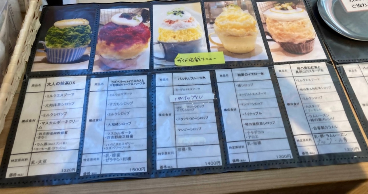 メニューはどれも美味しそうで迷いました。いろいろ食べてみたくなるかき氷です。