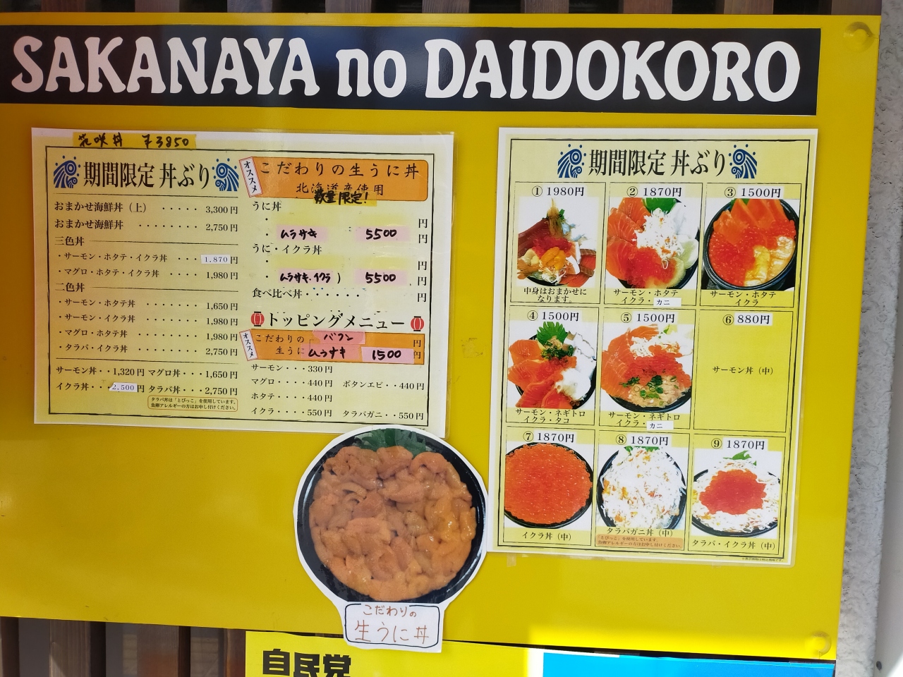 二条市場向かいにある海鮮丼屋です。海鮮丼以外のメニューもありますが。営業時間は市場なので7:00から、一応、ネタが無くなったら終了のようです。お手頃価格の海鮮丼もありますが、ちょっとプアーな感じ。好き嫌いがなければ、おまかせ海鮮丼をオススメします。