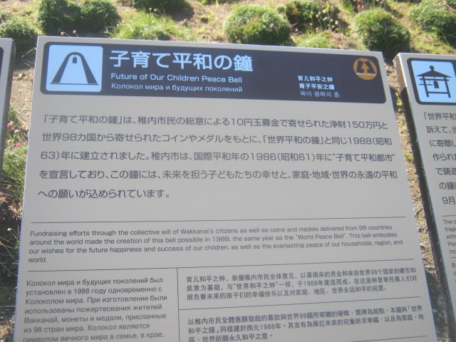 大韓航空機撃墜事件の犠牲者を悼む祈りの塔のすぐ向かい側、世界平和の鐘と横並びになっているアーチ型の鐘がこちらです。子育て、の呼称の通り、こちらの鐘に関しては、1986年に稚内市が子育て平和都市を宣言した際に設置され、未来を担う子供達の幸せを願う鐘とのことでした。