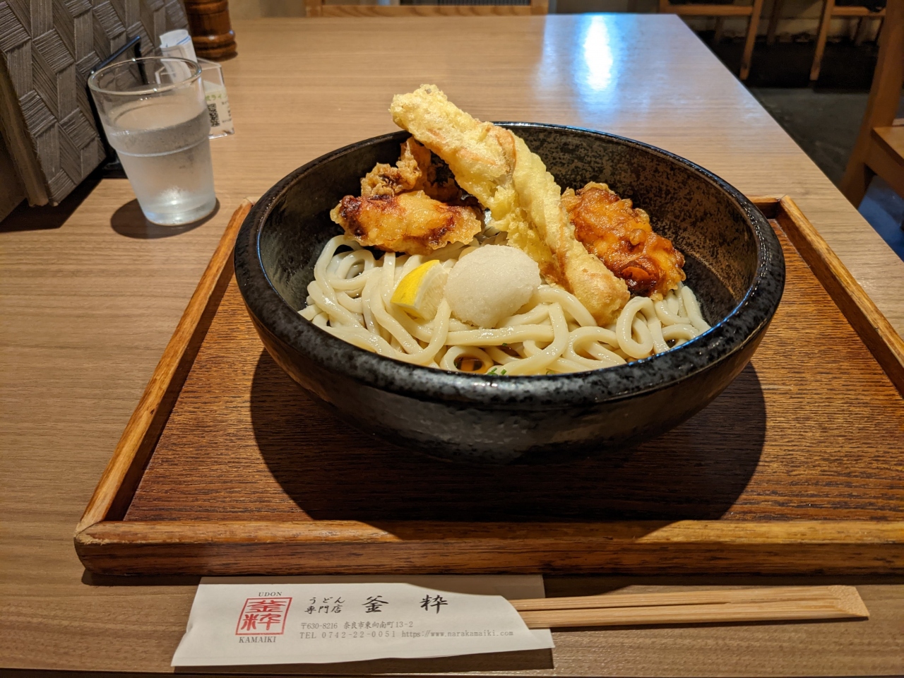 近鉄奈良駅近くのうどん屋さん。数件隣にもうどんやがあってうどん激戦区なのかもしれません。おしゃれな店内で、ラーメンみたいなうどんが出てきます。お値段はちょい高めなのかなと思います、提供する器のデカさはつるとんたん級でした。