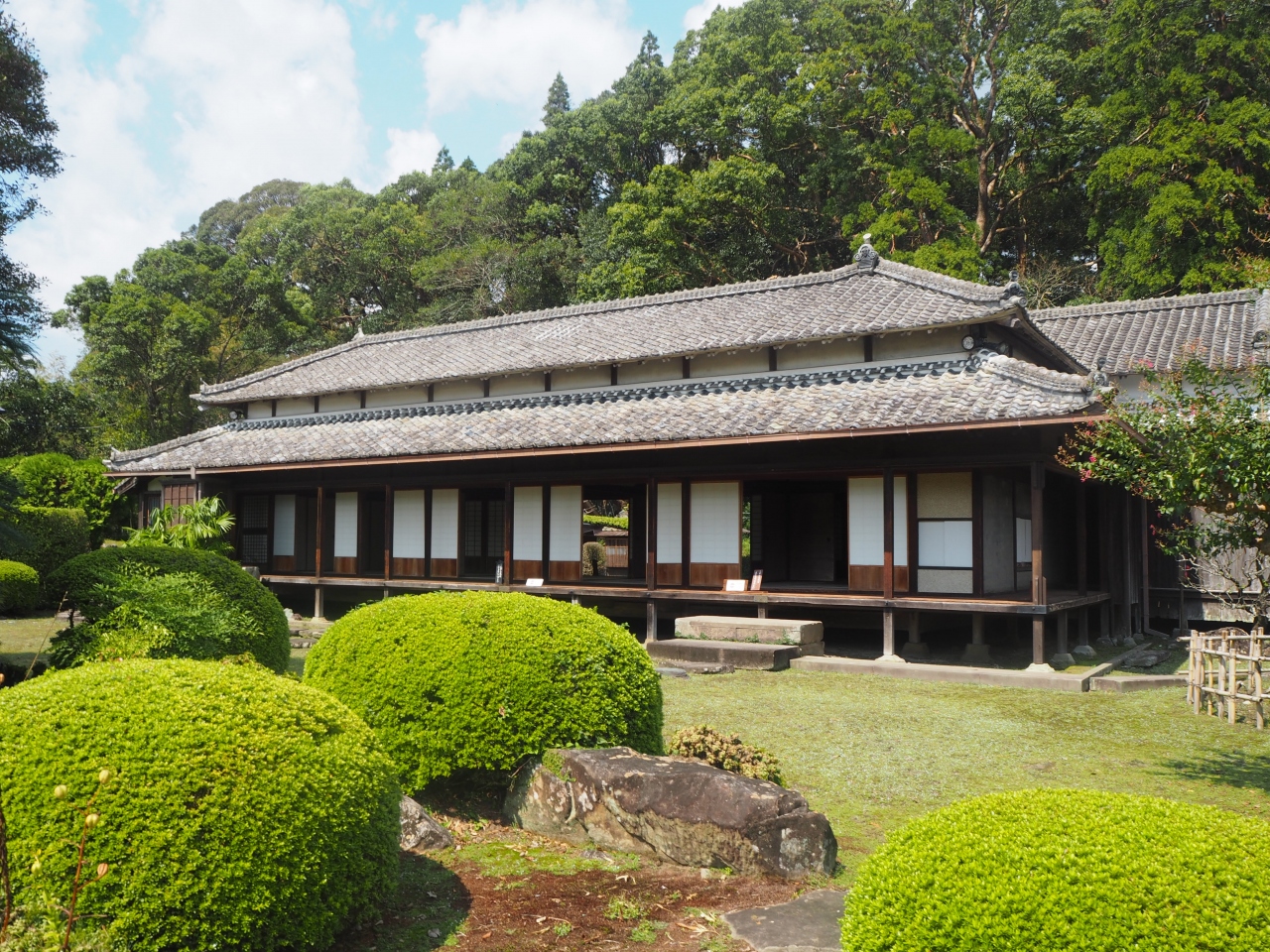 飫肥城の大手門の手前左側にある豫章館が伊東家の庭園がある場所です。飫肥藩時代は飫肥藩の重臣であった伊東氏の屋敷がった場所で、その後廃藩置県後に藩主であった伊東氏が住んだ場所です。屋敷の南側には大きな庭が広がり、現在は芝生や木々などがあり、落ち着いた庭園です。当時はどのように整備されていたのかは興味があります。