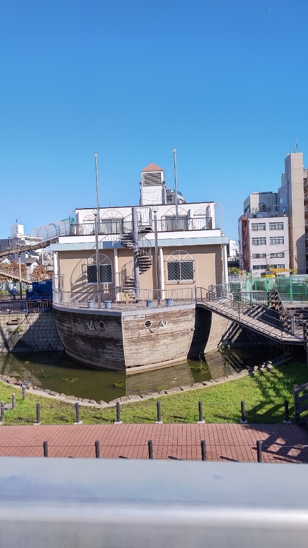 東京スカイツリーから浅草に向かう途中に突然謎の船舶が出現します。ここはもとは隅田川に続く河川でしたが埋め立てられ親水公園になっています。それなりに風情がありますが、夕方5時には閉まることと水がないことがやや物足りないです