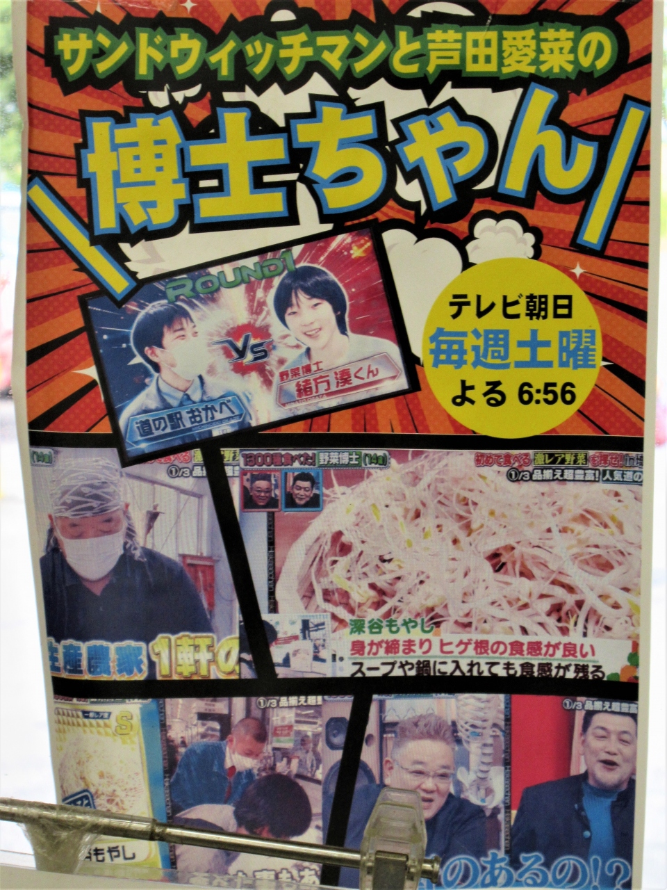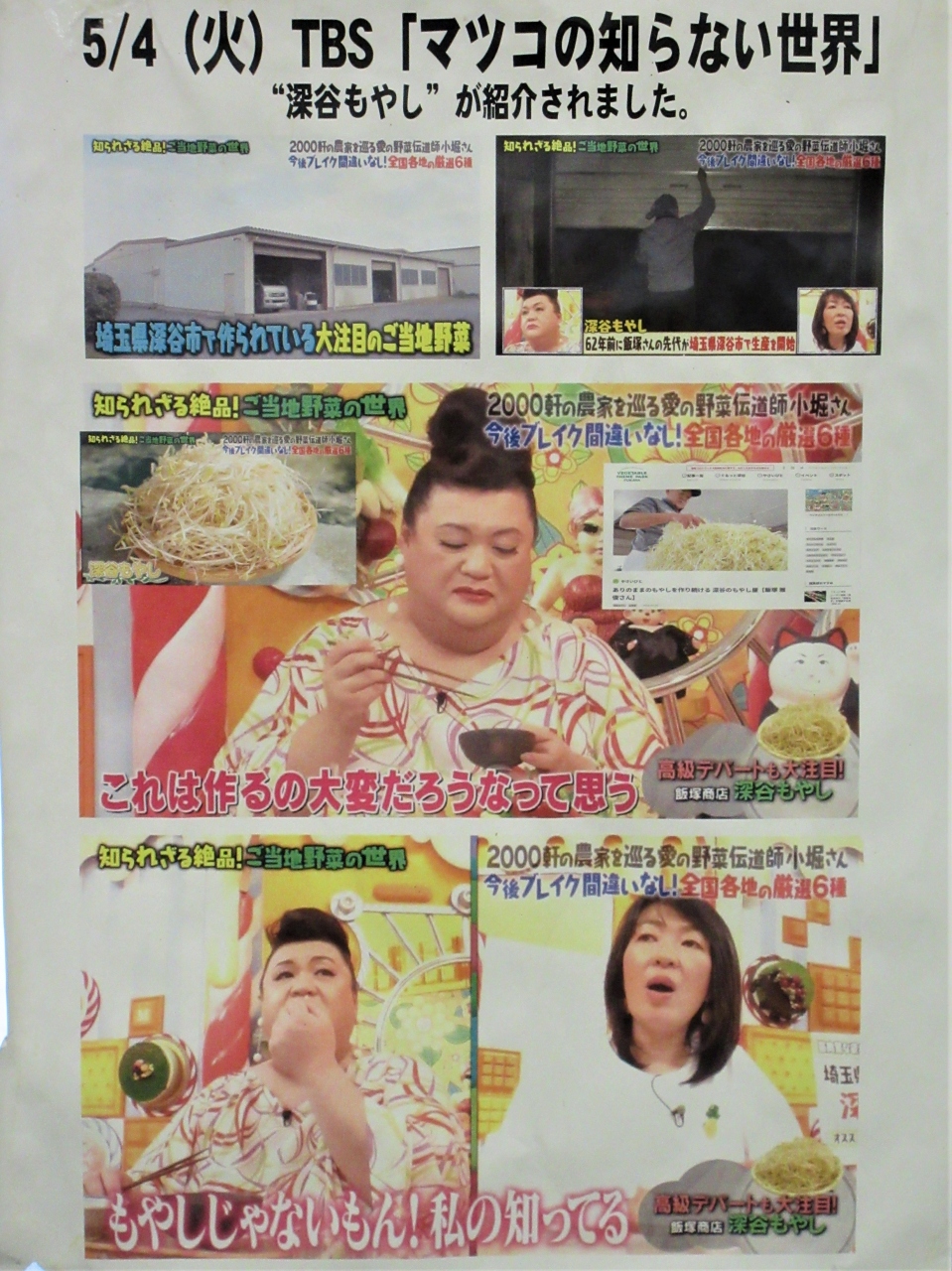 この「深谷もやし」は、テレビの『マツコの知らない世界』や『サンドイッチマンと芦田愛菜の博士ちゃん』でも紹介されたそうで、掲示されていました。