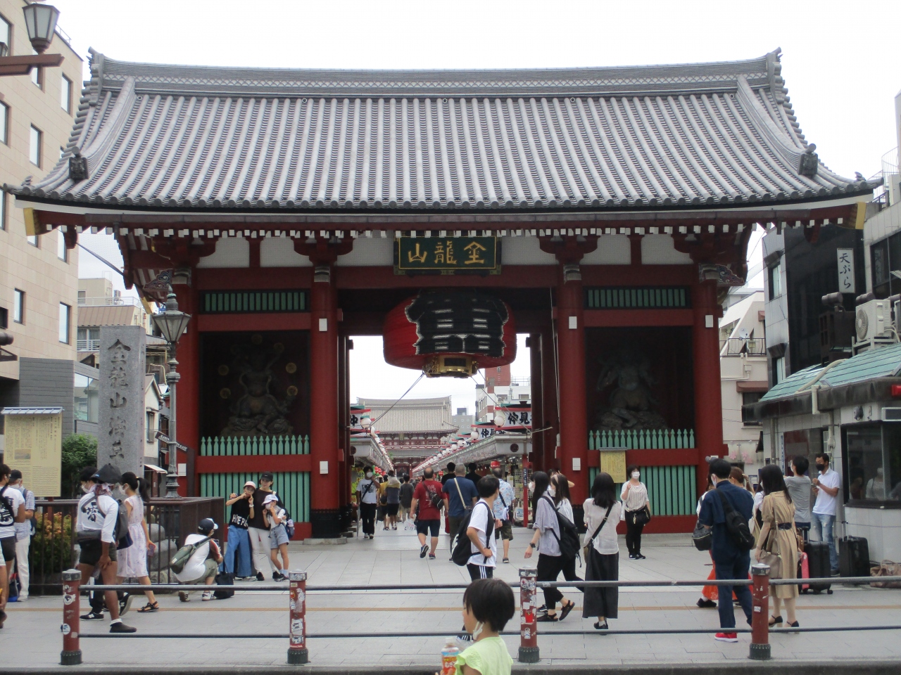 浅草の顔の「雷門」。浅草寺への入り口です。記念撮影を撮っているいる人、人力車の人などで賑わっています。今回浅草に宿泊したので何回か浅草寺に行きました。台風が近づいているという日は、提灯がたたまれていました。初めて見ました。台風対策かな?