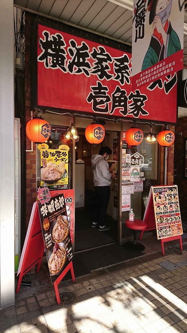 門前仲町駅からすぐ、永代通り沿いにあるチェーン店の横浜家系ラーメン屋さんです。ランチで横浜家系ラーメン醤油並をいただきました。具は家系ラーメン定番の海苔3枚、チャーシュー、ホウレン草、ウズラの卵で、太めの麵と独特なコクの豚骨醤油スープの一品です。壱角家はチェーン店ですが、お店によりスープの味が微妙に異なり、こちらの門前仲町店はやや味が濃い目のような印象を受けました。