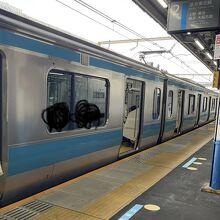 外側に水色の線がある長椅子の車両で普通の通勤電車のような感じです。