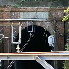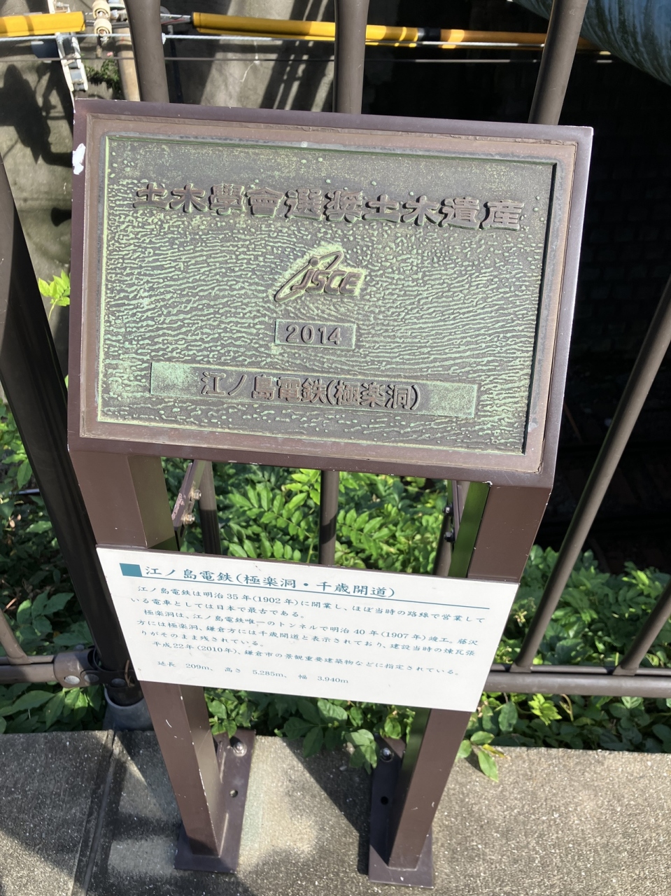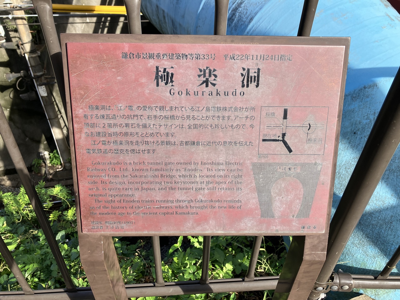 江ノ電「極楽寺駅」下車してすぐの長谷側のトンネルです。朱色の「桜橋」からこのトンネルを出入りする江ノ電が見えます。建設当時の煉瓦造りの坑門の上には「極楽洞」という文字がうっすらと読み取ることができます。2014年に日本土木学会推奨土木遺産に登録され、その銘板が極楽寺駅前にありました。