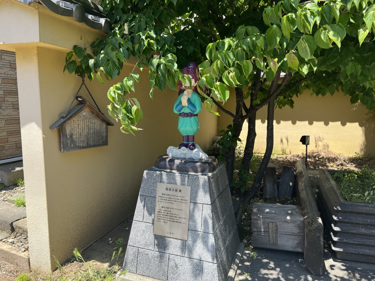 上田駅から歩いて15分、旧北国街道の柳町の古い街並みの入口に霧が暮れ才蔵の像があります。鮮やかな緑色の忍者服を身につけた、50センチほどの像です。自動車通り沿いにありますが、木の葉に隠れるように像がありました。