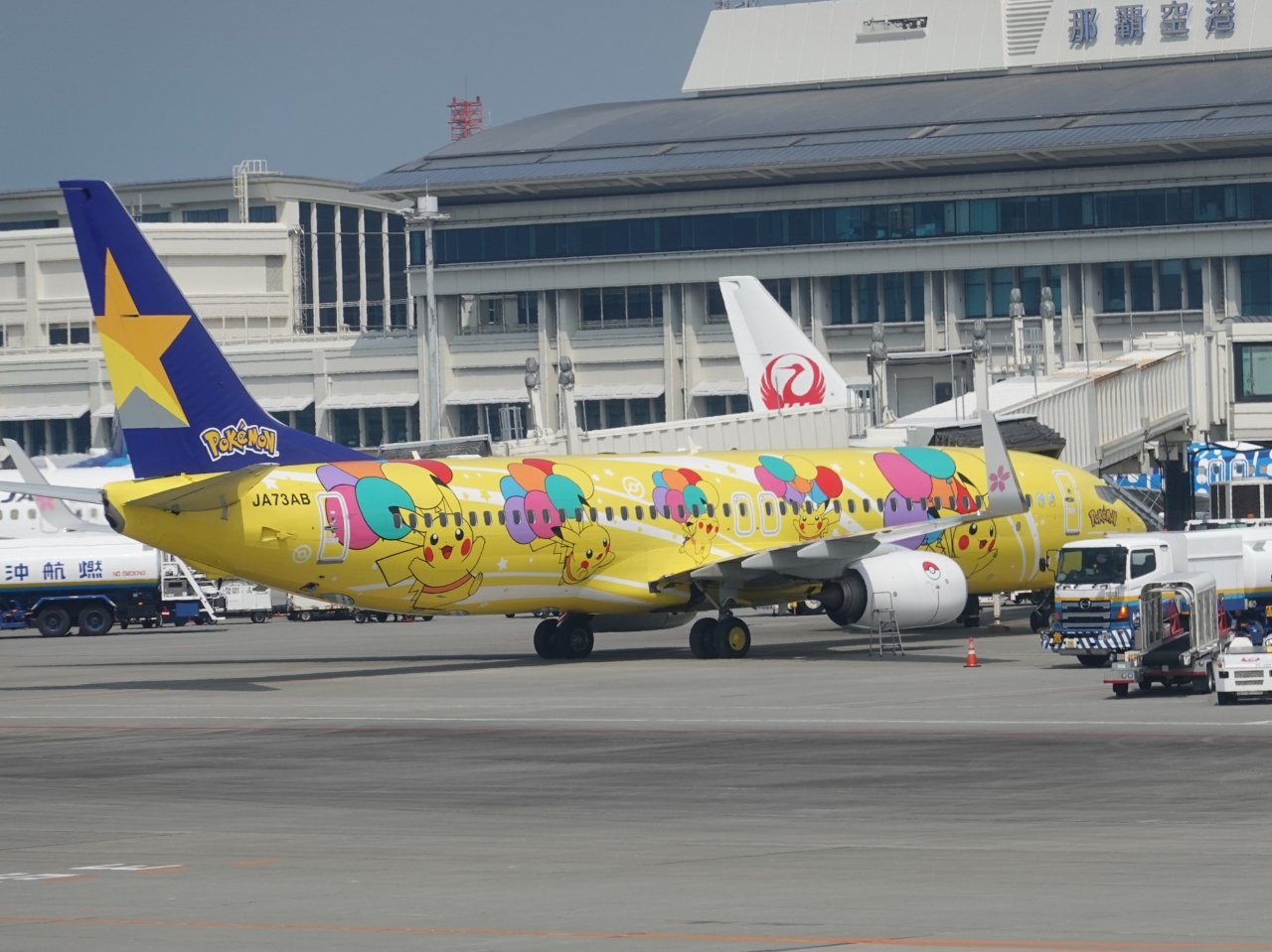 羽田との往復で那覇空港の国内線ターミナルを利用しました。JAL便を利用したのですが、スカイマークと同じエリアを使用していて、スカイマークのポケモン特別塗装機が隣にいました。那覇空港の国内線ターミナルは出発旅客と到着旅客が同じ制限区域内を利用するので、飛行機を降りた瞬間に買い物もできて便利ですよ。