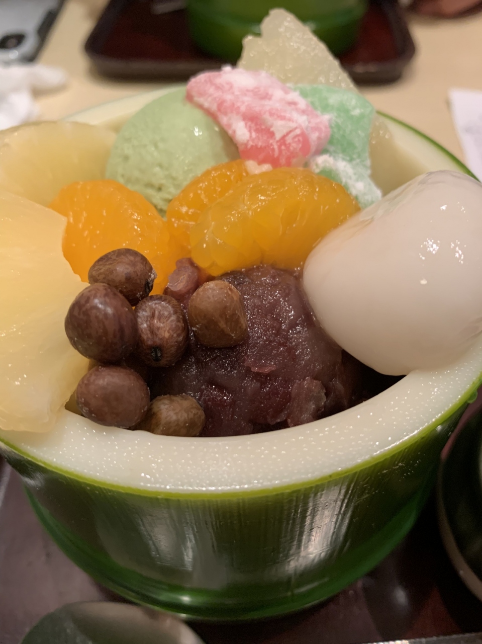 昔ながらの趣がある甘味処へ。店の看板メニューでもある竹に入ったあんみつをいただきました。竹の容器はもちろんプラスチックですが、フルーツや白玉がたくさん入ったあんみつです。時間がかかったので、白玉をゆでていたのだと思います。もちもちでした。