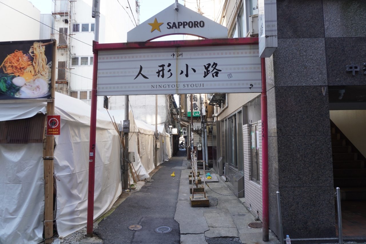 人形小路は、福博であい橋を渡って中洲に入ってすぐ。かなり細い路地で普通なら気が付かずに通り過ぎてしまうでしょう。入口に看板があったので入ってみましたが、ちょっと入り組んでいて迷路に迷い込んだような場所もありますね。反対の出口の方にも看板が出ていましたが、この看板は確かに大事。これがなければお客さんは入ってこないと思います。