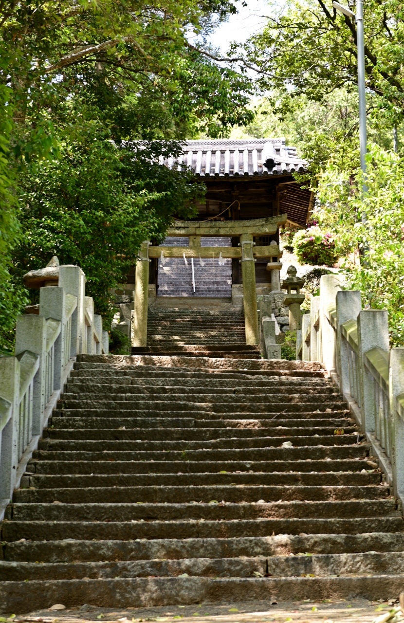 日本の歴史公園百選に選定された「かもがた町家公園」のすぐそばにある神社だ。由緒書きによると、平安時代に京都加茂明神を勧請し創建された。数回の火災に遭い、現在の建物は明治末期の再建だという。地元には「鴨方には過ぎたものが三つある」という里謡があり、そのうちの一つに数えられるのがこの神社にある「宮の石橋」だ。石六枚をそらせた太鼓橋で、随身門の下にある。雰囲気のある境内で、町家公園へ寄った際は是非とも足を伸ばしたい。