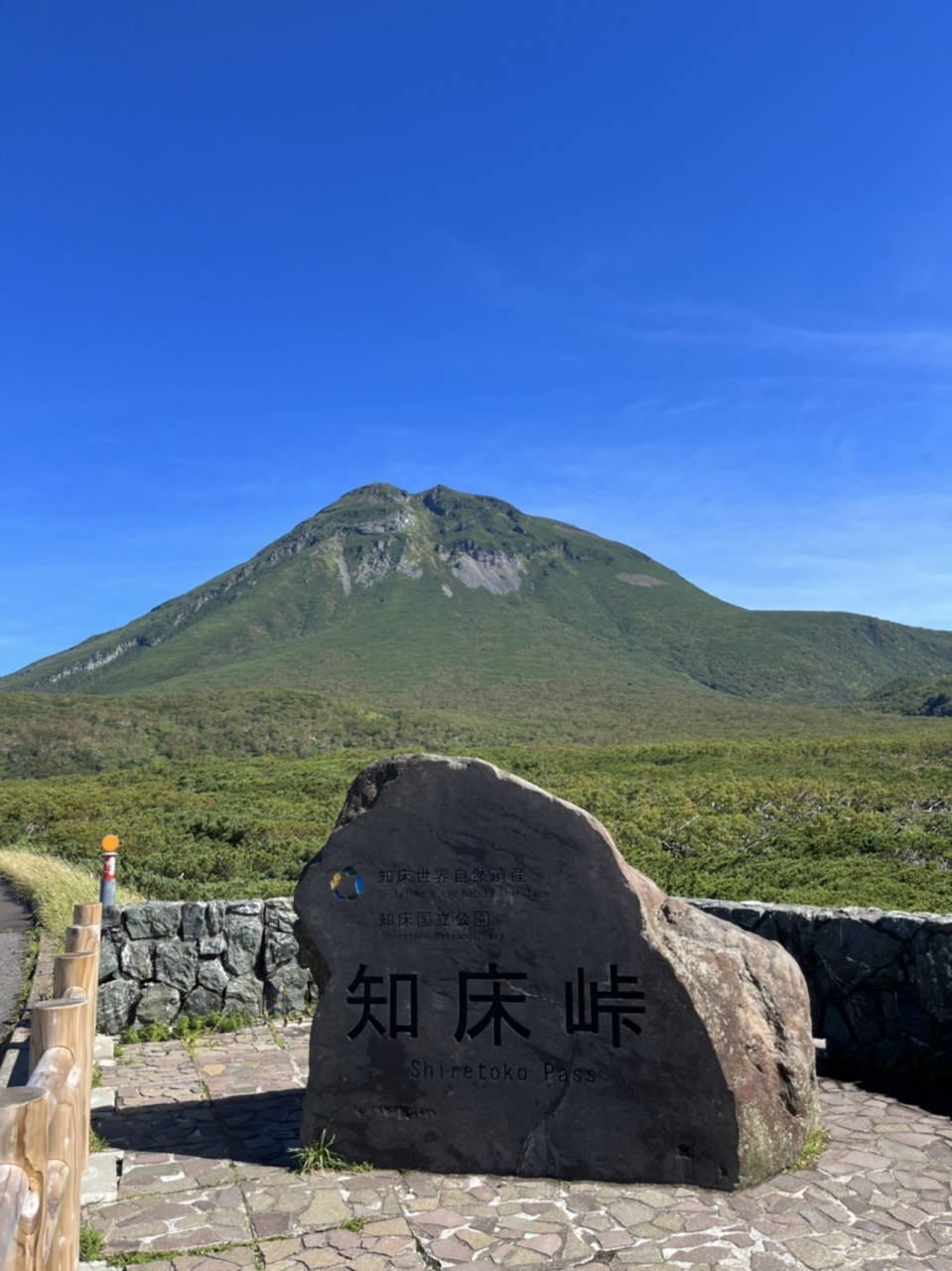 訪れた9月初旬は雲一つない快晴でした。知床峠の駐車スペースでちょっと休憩。道路を渡ると展望スペースになっていました。目の前には羅臼岳がそびえ、反対側の海にはうっすらと北方領土の国後の島影も確認できました。