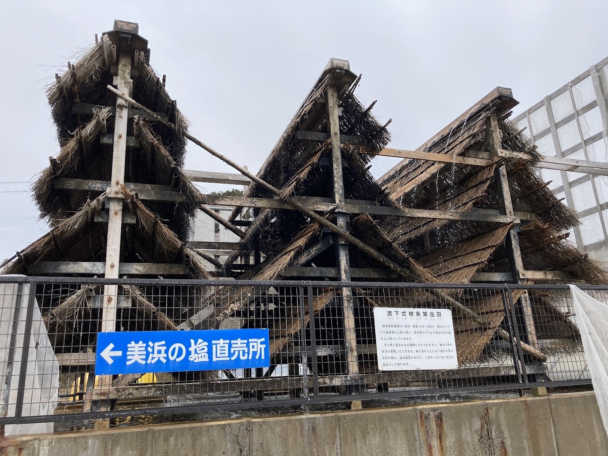 駐車場に入って目を止めるの流下式枝条架塩田という、塩を作る装置です。昔から海水を使って塩づくりをしていた美浜ならではだし、装置だけでなく、実際に動いているのが見れるのが良いですね。