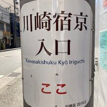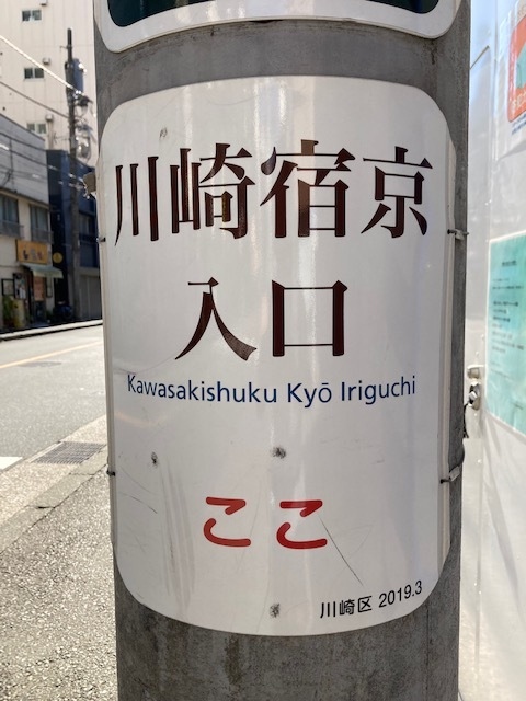 以前はここに関札のレプリカや川崎宿の説明などが掲げられていましたが、今は写真のような表示が電柱に貼られているだけです。見どころなど無いも同じです。たぶん工事によって撤去されたのでしょう(ビルが建築されていました)。川崎宿の史跡は、他の場所でも新しい建築物によって撤去されています。もう少し配慮があってもよいように思います。
