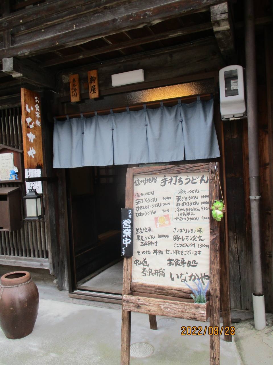 信州といえば、蕎麦を思い出すのですが、こちらは奈良井宿で、古民家を利用して、ご夫婦が営む手打ちうどんのお店でした。メニューに、「やみつきうどん」とか「ひねうどん」とかあって興味深かった。信州の地粉を使っているそうです。