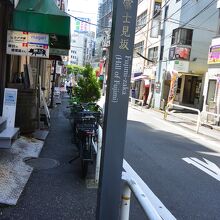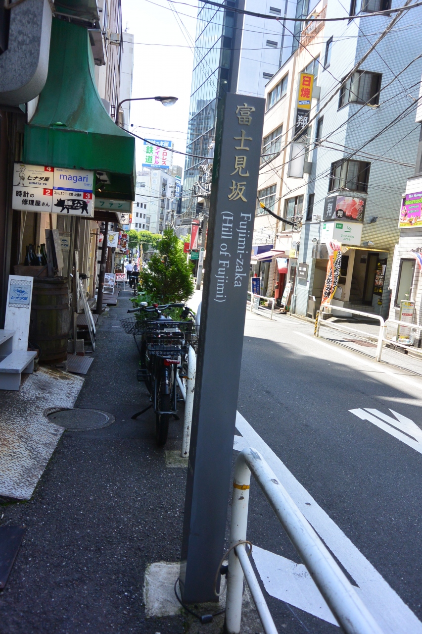 飲食店が多く軒を連ねる短い坂でした。昔は富士山が見えたと、坂の名前を書いた案内の柱には書かれていましたが、今は、坂の先は交差点になっていて、その先にはビルが建っていて、富士山を見ることはできないようです。