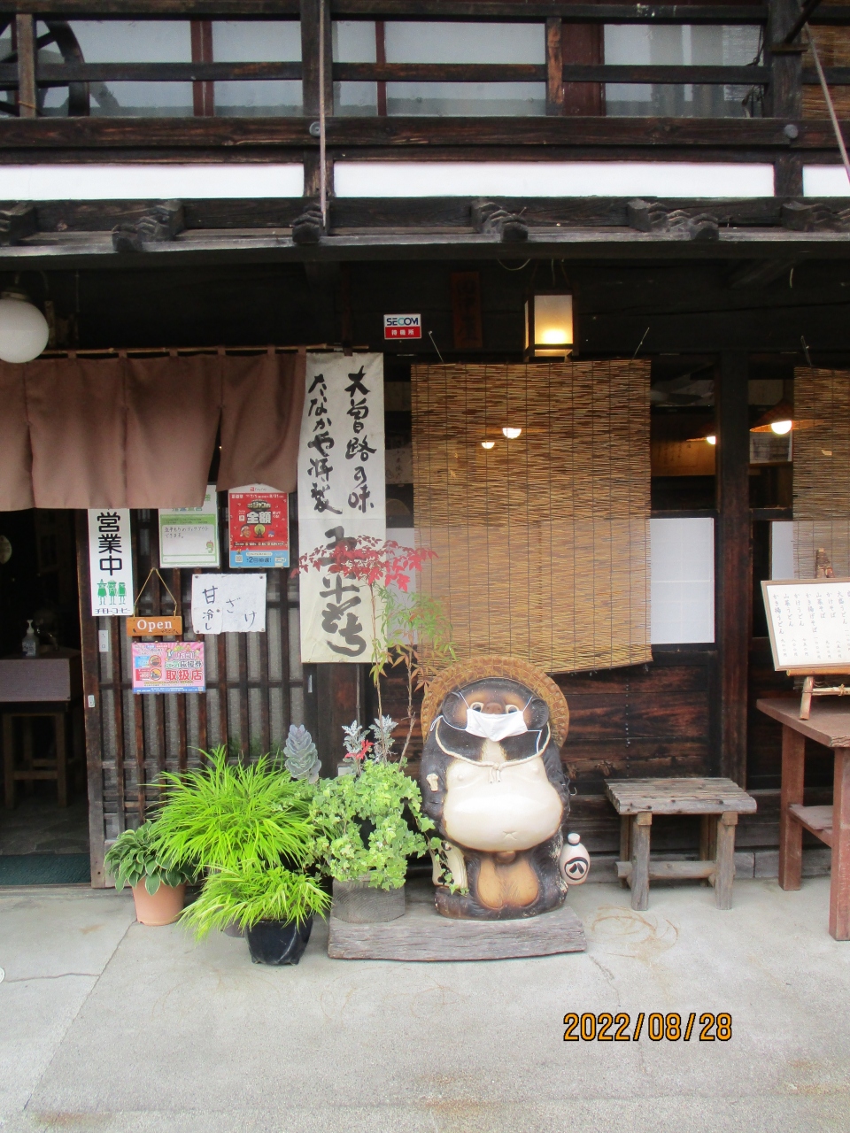 奈良井宿の中程にありました。入り口に帽子をかぶった狸がいるのが目印でした。ご夫婦オリジナルの秘伝の味噌だれで食べる五平餅がオススメです。他には、お団子、おやき、コーヒーなどで、蕎麦とうどんは不定期のようでした。