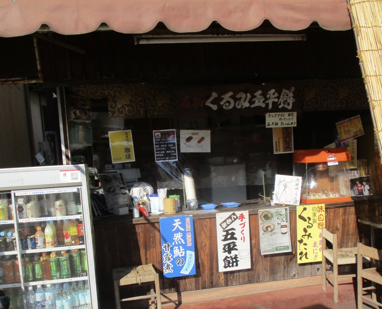 土産物屋で、遊覧船乗り場やさざなみ公園に行く前に、立ち寄りました。土産物屋なのに、店頭で、鮎の塩焼きや五平餅を実演販売していて、足が止まりました。特に五平餅がくるみ五平餅というからたまりません。ヨダレが出ました。