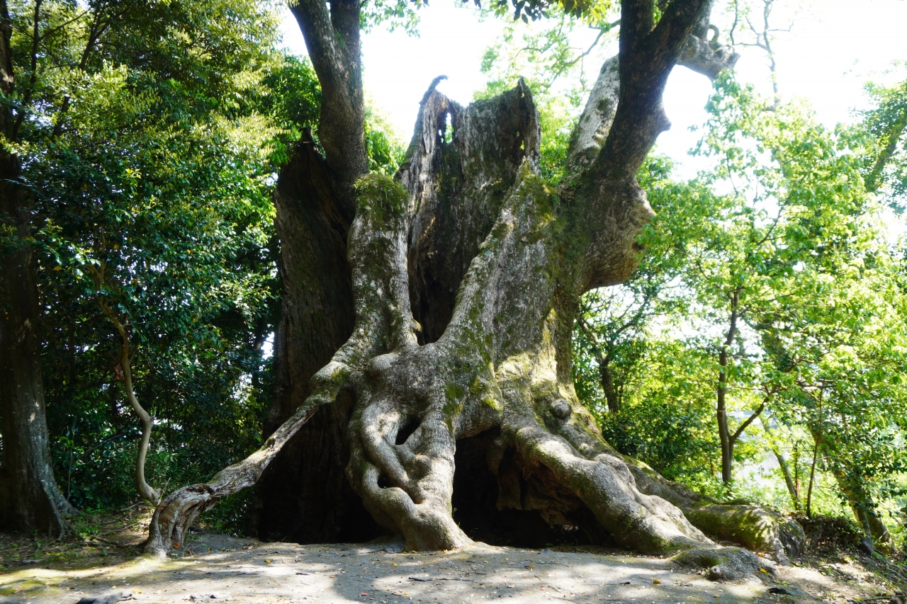 武雄温泉には佐賀県の大木ベストスリーがすべて揃っていて、川古の大楠、武雄の大楠とこの塚崎の大楠。樹齢は2000年とも3000年とも言われ、樹高18m、幹回り13.6m。落雷に遭って一部幹部分が失われたようですが、幹中央の空に向いた空洞や根元の広い空間等古木でないと見られない姿はさすがです。