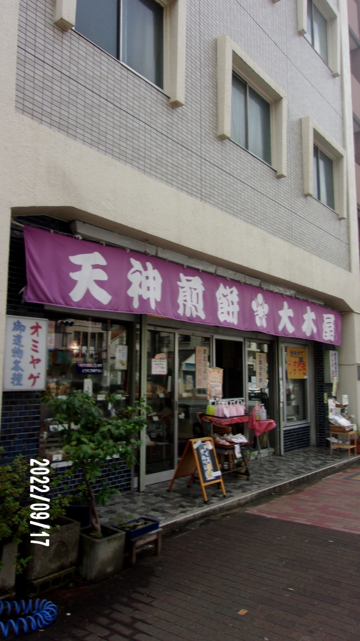 この天神煎餅・大木屋は蔵前橋通りに面しています。通りの向かいは亀戸天神の参道入り口です。このお店は明治40年創業です。今もそのころと同じで炭火へ焼き上げたせんべいを醤油味で作り上げます。今は多様化していますが伝統的なものもしっかりと残っています。