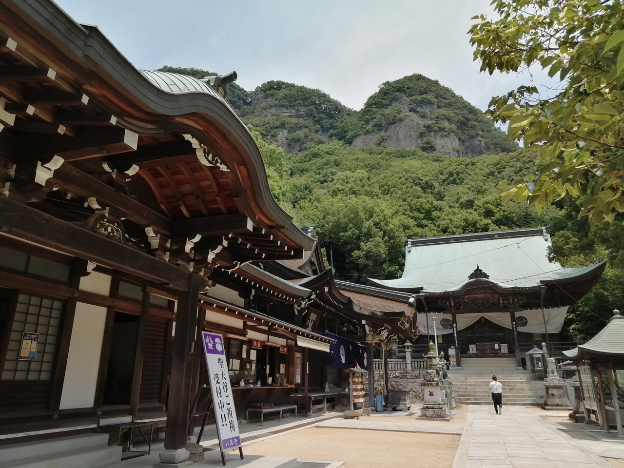 八栗寺からは木や建物がじゃまをして5つの峰を同時に見渡せるポイントは少ないですが、ケーブルカーの八栗山上駅を出て100mほどの地点か山門手前の参道からならきれいに5つの峰が眺められます。向かって右端の峰が分かりづらいですが、その昔宝永4年(1707年)の大地震で崩れてしまったようです。