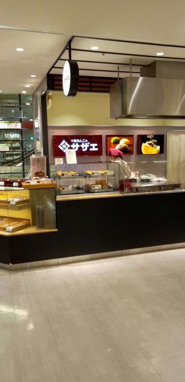 高槻阪急の地下1階の食品売り場の西端にあるあんこが美味しい店です。北海道十勝産のあずきを使った大判焼きやたい焼きとみたらし団子やぜんざいも売っています。テイクアウト店なので前のテーブルコーナーで食べます。