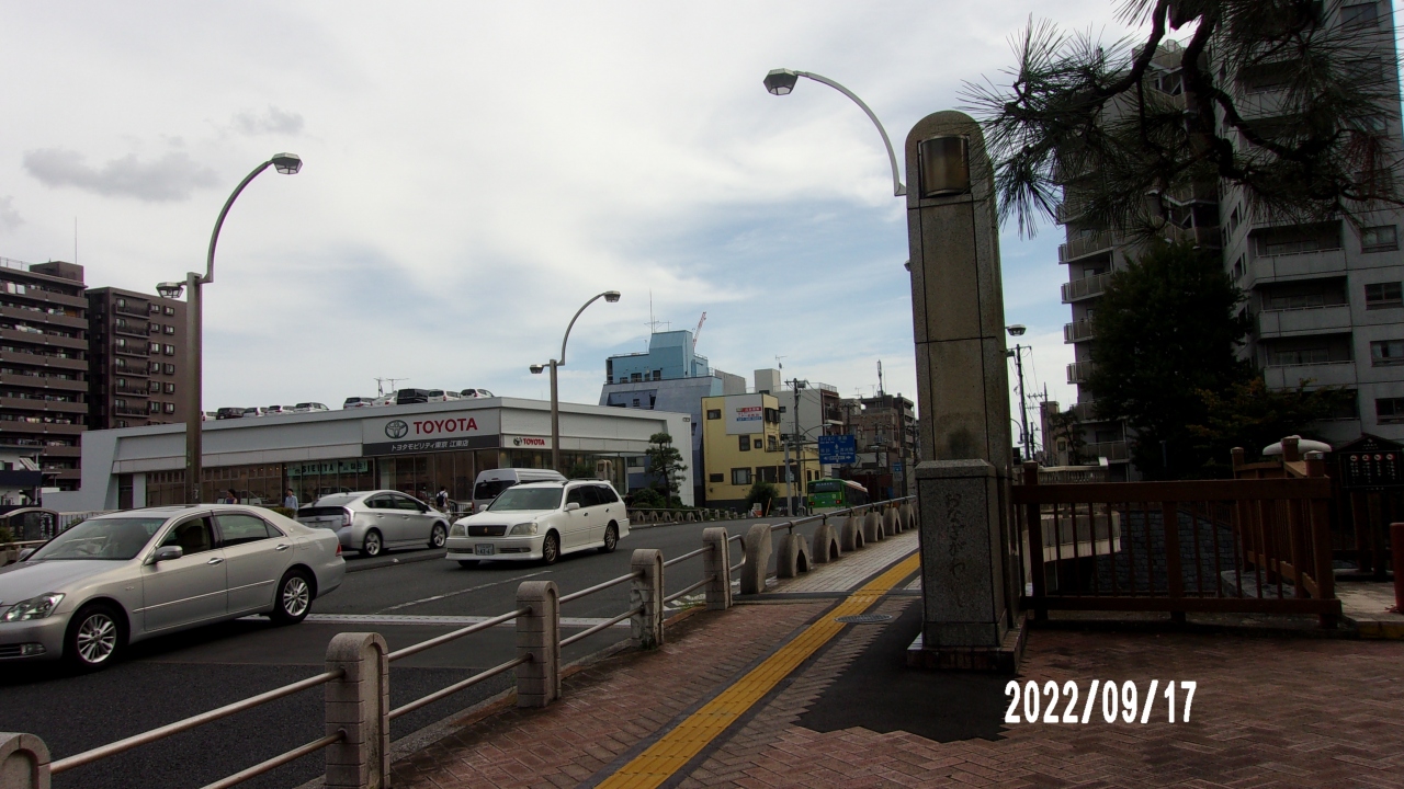 この小名木川橋は四ツ目通りの小名木川にかかる橋です。この橋の西側には扇橋閘門があります。橋からその全貌がよく見えます。この橋は明治末に木製の橋でつくられました。その後関東大震災後に復興事業として今のようなコンクリート造りになっています。この橋は地下鉄都営新宿線と東京メトロ半蔵門線の住吉駅から南に5分強の場所にあります。車両の交交通量が多いです。