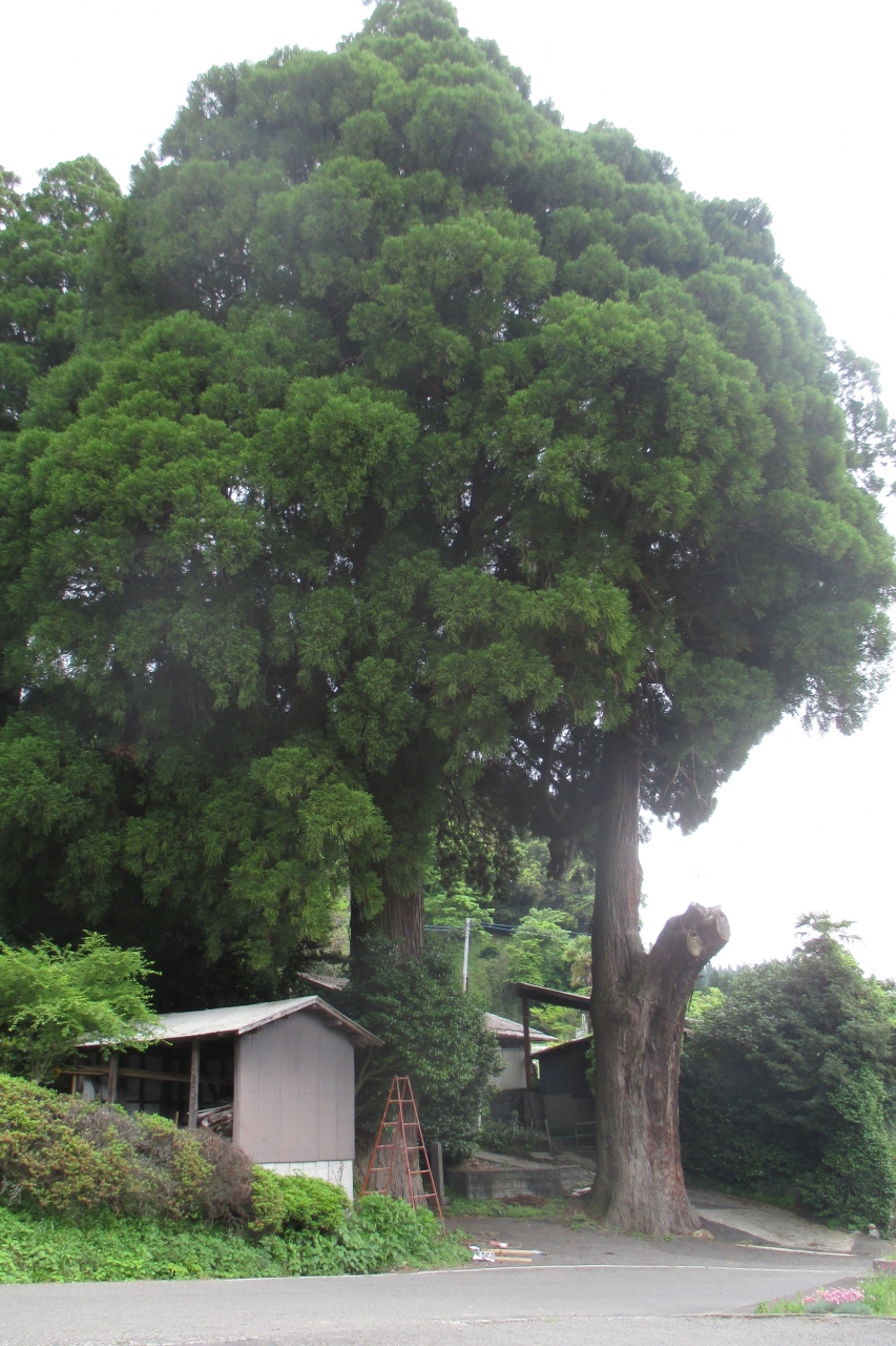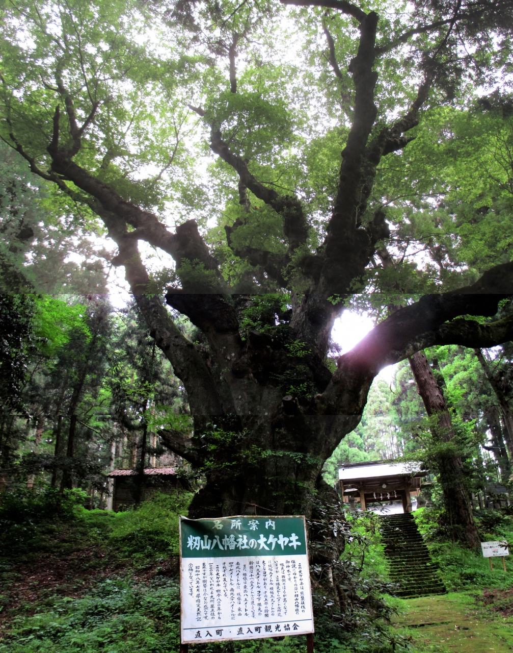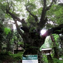 神社のお参りは第一義ですが、ここには3つの天然記念物がありますので外せないところです。まずは、大きな杉の木の並木の続く参道です。これは「籾山神社のスギ並木」として市指定です。樹齢は100年~200年、中には400年もあり、迫力のある並木です。奥に進むと、最大の見どころである巨古木のケヤキがあります。これは「籾山八幡社の大ケヤキ」として県指定です。大小の瘤があって、樹齢は800年~1、000年で、圧倒的な迫力です。拝殿をお参りすると、近くに大きなケヤキの木があります。これは「籾山神社の二股ケヤキ」として市指定です。根本近くで二股に分かれ、樹高36m、樹齢は400年以上です。何といっても、ここでは大ケヤキです。現在、九州で2番目に大きいケヤキの木とのことです。その瘤だらけの奇怪な古木には目がテンです。
