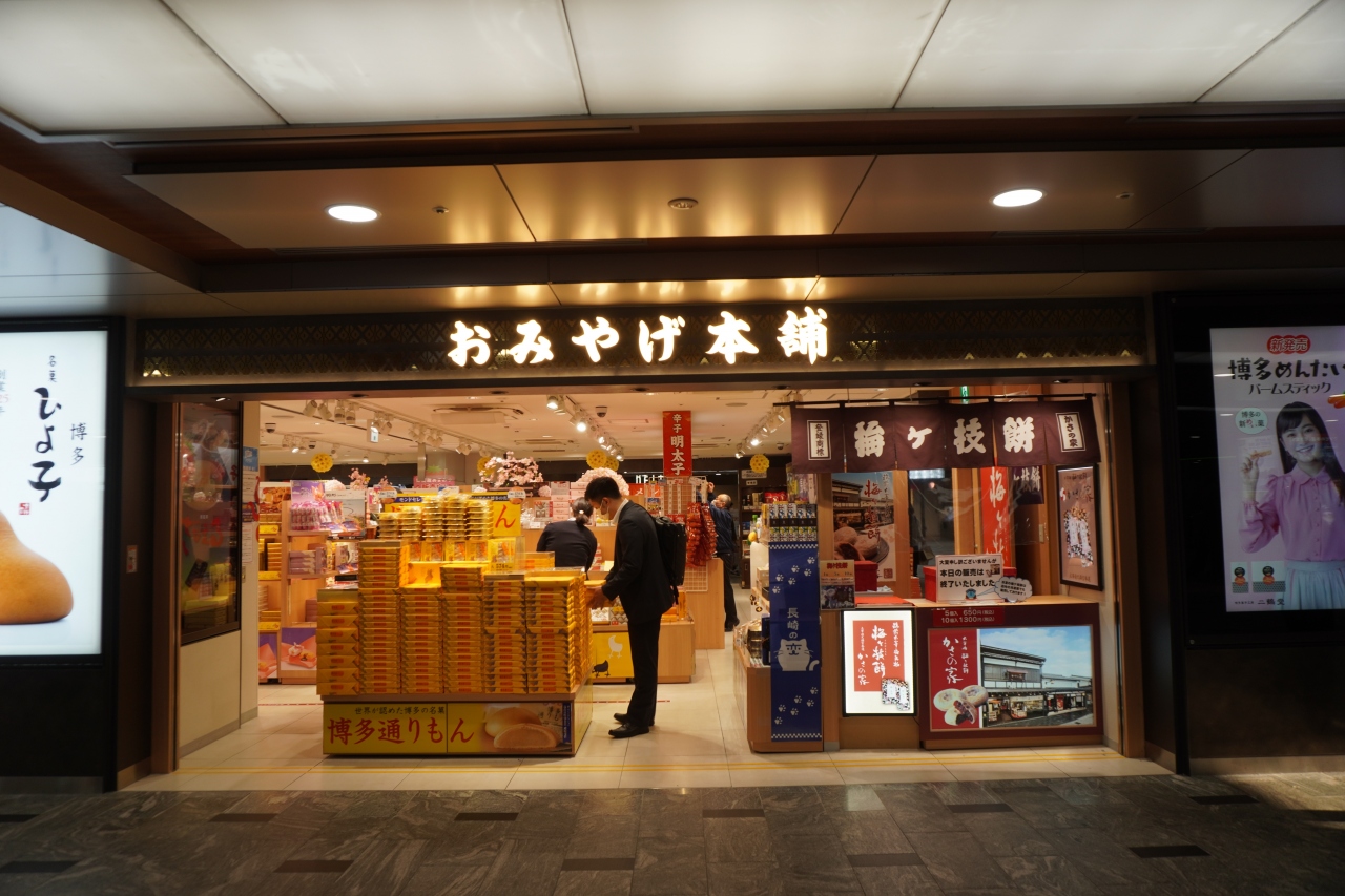 新幹線の中央改札を出てすぐの正面にあるお店。この時間はやっていませんでしたが、太宰府の人気店かさの家の梅ケ谷餅を取り扱っているのは価値ありかな。定番の博多通りもんとかが山と積まれていて、そんなのもお土産はなにが人気なのかとか分かりやすいと思います。