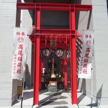日本橋川が隅田川に注ぐ河口部に架かる豊海橋から150mほどのところに建つ神社です。鉄製の真っ赤な鳥居が目じるしの神社で、ビルの1階に建っています。鳥居の先には山車に乗った小さな社殿が建っています。江戸時代初め、伊達綱宗の怒りを買った新吉原の遊女、二代目高尾太夫を祀ったことが起源の神社です。昭和に入り神社再建工事の際に社殿下から高尾太夫の骨壺が見つかり、現在も実物の頭蓋骨が祭神として安置されているそうです。実物が祀られている珍しい神社です。