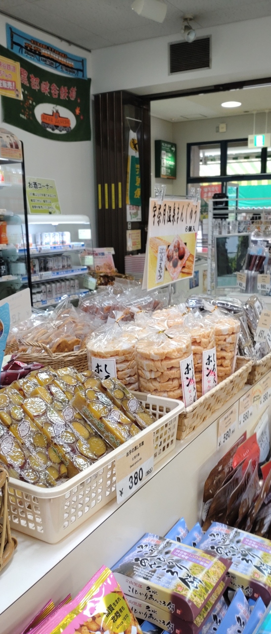 「宇奈月・くろべ食べ歩きクーポン」の引換の対象店になっていたので、レジへ向かいました。富山地方鉄道宇奈月温泉駅にある売店として、お客さんも絶えずいらしていて忙しそうでした。「黒部峡谷濃厚ショコラケーキ」2個との交換です。もっちとした意外な触感があるケーキでした。