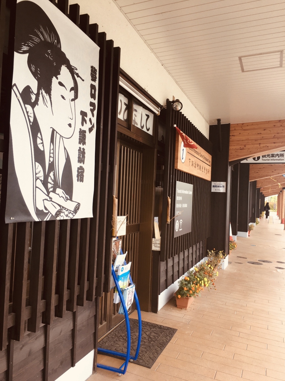 下諏訪駅改札口出て、右側にあり、駅舎と同じ建物です。江戸情緒がある和風ぽい黒い外観で、絵も飾ってあります。無料休憩所も備えていて、諏訪の観光地図等を入手しました。細かく記載してされていたので周遊時に重宝しました。